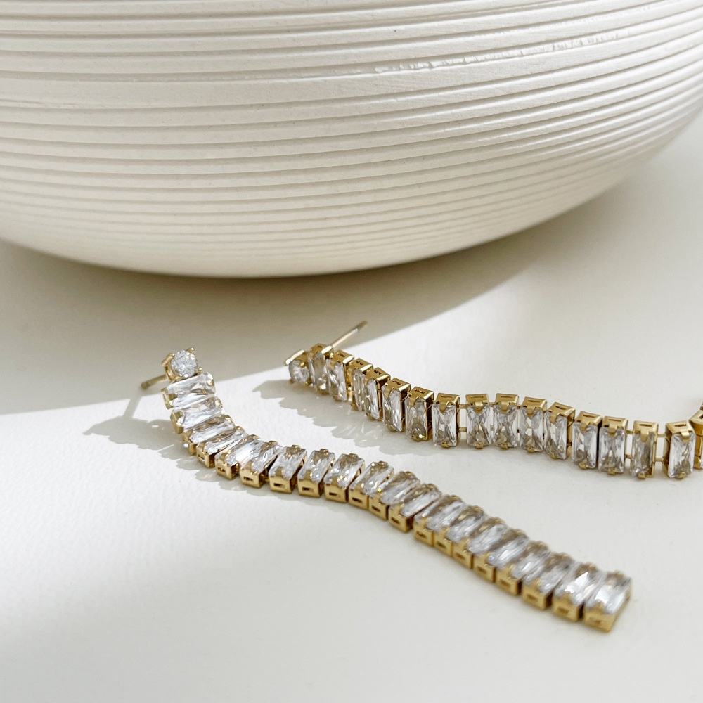 2024 New Stainless Steel Jewelry Rectangular Zircon Chain Eardrop Long Tassel Full of Star Earrings