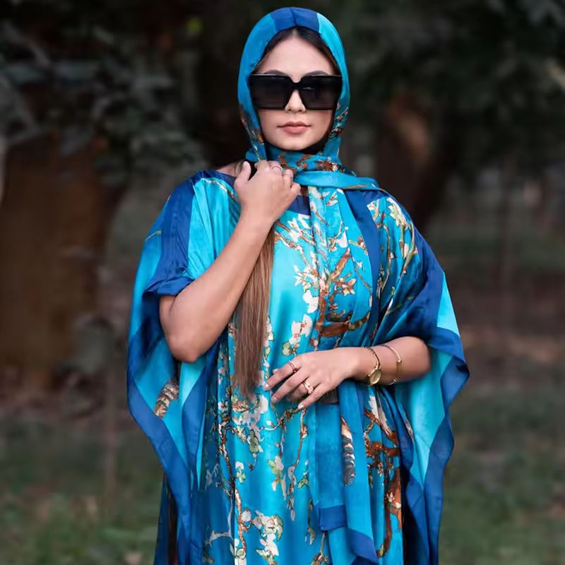 Blue Flower Print Hot Sale Brocade Burqa Women’S Long Dress Clothing Dress African For Women