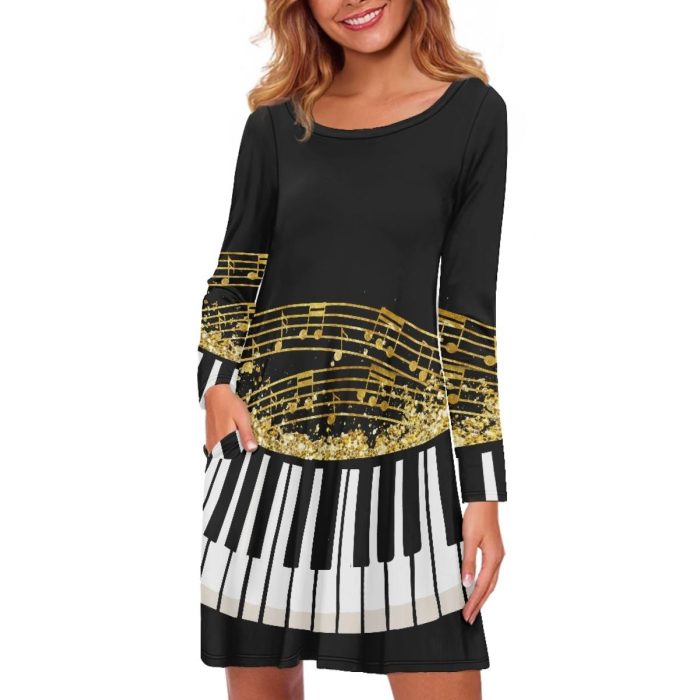 Custom Design Dress With Music Pattern Wholesale Casual Long-Sleeved Crew Neck Dresses Quick Dry Comfortable Breathable Clothing
