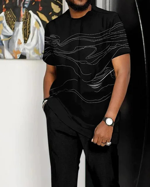 Men'S Black Lineart Short Sleeve Athletic Walking Suit Cotton Breathable Man Suit Summer Clothes For Men