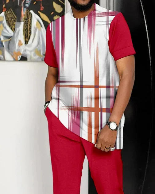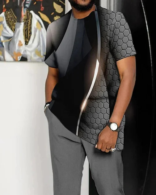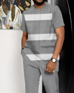 Men's Dark gray Line Print Short Sleeve Sports Walking Suit clothes man summer clothes for men