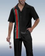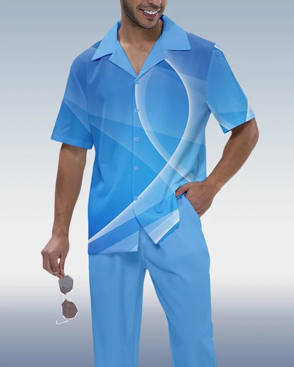 Classic Retro Navy Blue Line Short Sleeve Walking Suit Cotton Breathable Clothes Men Style Set Suit For Men