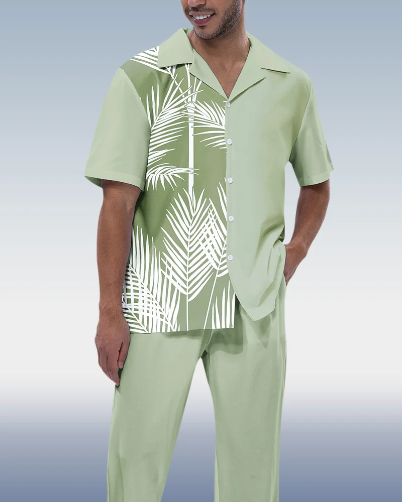 High Quality Men Green Leaf Print Short Sleeve Hiking Suit Cotton Breathable Clothing Wholesale Clothes Men Style Set
