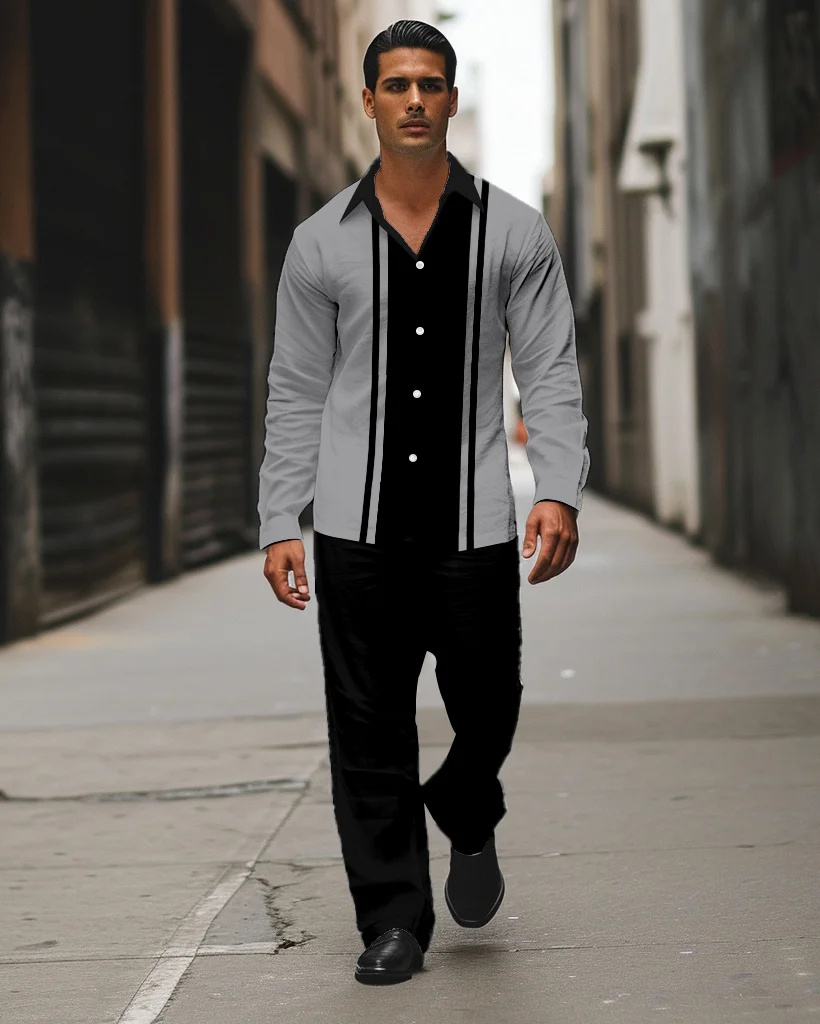 Men’S Striped Printed Long Sleeve Grey Shirt Walking Suit Men’S Suits Clothes For Man