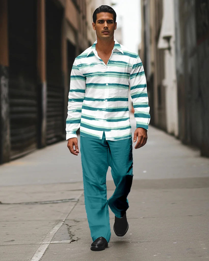 Men'S Striped Printed Long Sleeve Light Blue Shirt Walking Suit Clothes Men Suit For Man