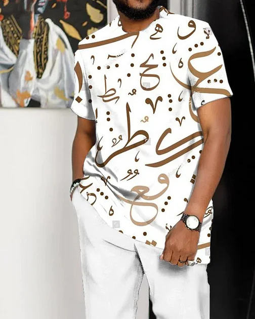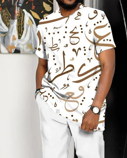 New Design Men’S White Art Print Short Sleeve Suit Cotton Breathable Clothes Men Suit For Man